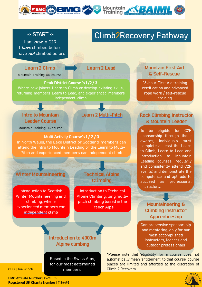 All members begin their Climb 2 Recovery journey via one of our three 4-day Learn to Climb courses in the Peak District each year, thereafter progressive and increasingly advanced courses and opportunities become available - from the Learn to Lead, to Learn to Multi-Pitch, Alpine Climbing, Winter Mountaineering and expeditions. If progression and more advanced courses aren’t a priority for you at the moment - that’s fine, you can always repeat the courses you have attended or attend a course to climb independently.